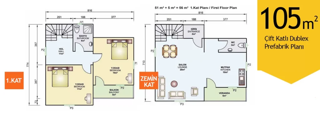 105 metrekarelik bu çift katlı prefabrik ev, hem şıklığı hem de fonksiyonelliği mükemmel şekilde birleştiren bir yaşam alanı sunuyor. Modern tasarımı ve verimli iç yapısı ile her detayda konforu ön planda tutar. İki katın sunduğu geniş alan, aile yaşamı için son derece idealdir.